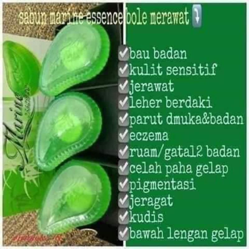 - Anti-bakteria anti-alergi anti-keradangan. Sebab sabun ni mampu membantu untuk menanggalkan cela-cela noda-noda hitam di ketiak atau celah-celah. Sabun marine essence Rasanya semua org kenal dengan sabun hijau nipopular gak dengan panggilan sabun ketiakwangi n berkhasiat sungguh sabun ni utk penjagaan kecantikan kesihatan kulit.